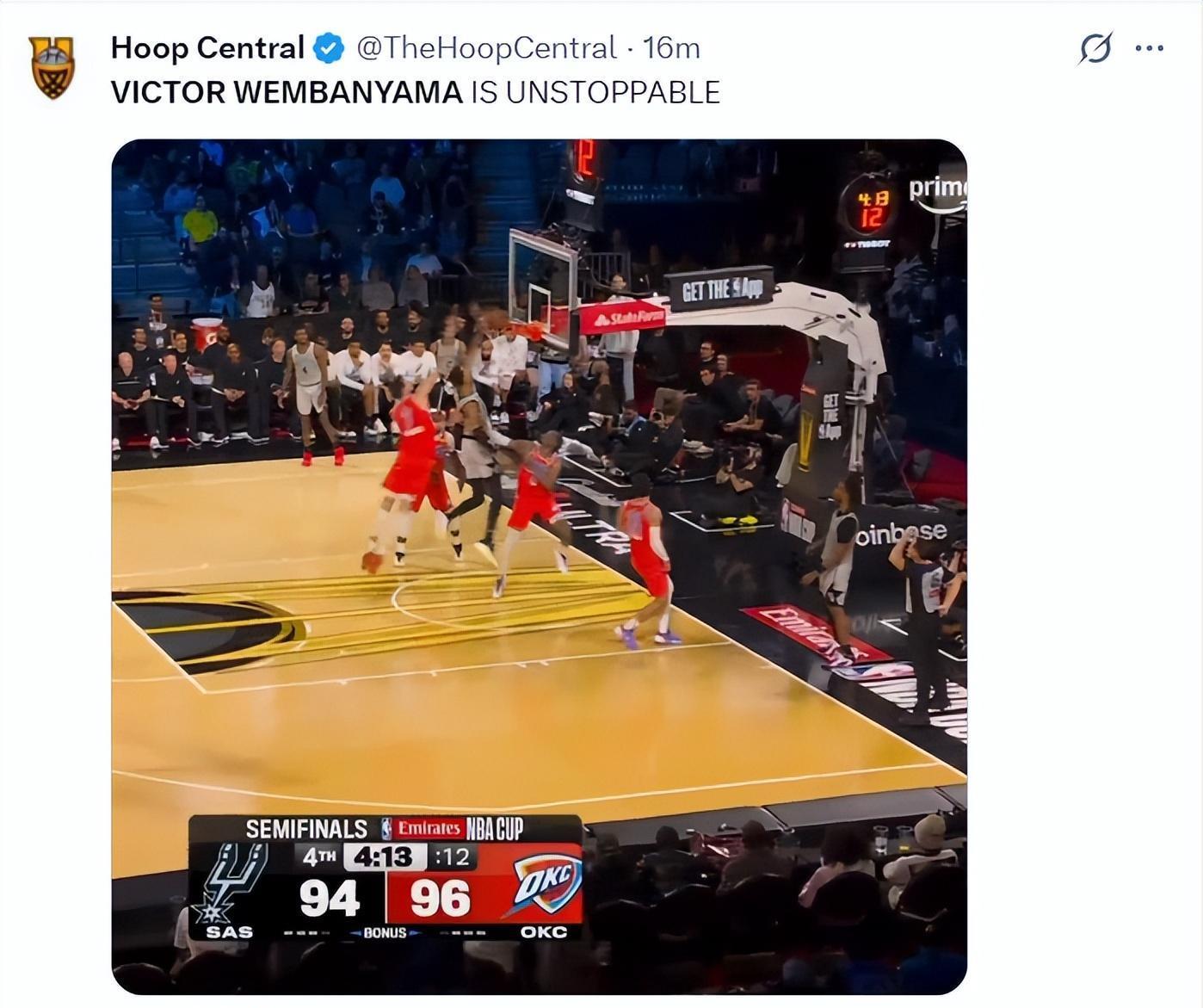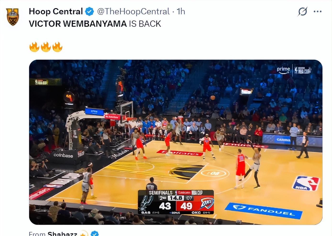 北京时间12月14日,圣安东尼奥马刺队迎来了维克托-文班亚马的复出,他自11月17日后伤停至今已经过去了27天之久,也因为他的伤情此役他有登场时间限制,上半场仅打7分,全场比赛也只打了21分钟不到(20分39秒),可他无比强大的比赛影响力帮助马刺爆冷击败了联盟第一的雷霆,OKC吞下赛季第二场失利。