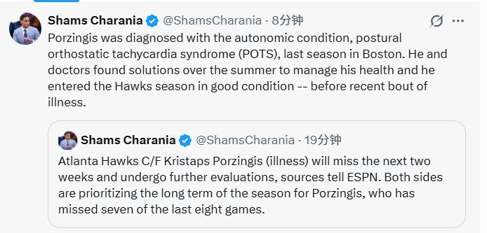 上赛季效力凯尔特人期间,波尔津吉斯被确诊患有自主神经功能障碍类疾病——体位性心动过速综合征。休赛期,他与医疗团队共同制定了健康管理方案,得以以良好状态开启老鹰队的新赛季征程,直至近期突发疾病。